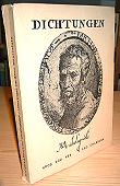 Michelangelo Buonarroti, Reime scelte / Ausgewaehlte Dichtungen. --> VERKAUFT! Michelangelo Buonarroti, Reime scelte / Ausgewählte Dichtungen. Celerina: Quos Ego Verlag, 1950. 200 Seiten. Broschur mit Schutzumschlag. 351 g * Italienische Originale samt deutschen Umdichtungen von Hans Mühlestein. Signatur Mühlesteins auf der letzten Seite. Nummeriertes Exemplar (333). - Umschlag hinten rückenseitig ca. 2 cm eingerissen. Italienische Literatur | Bibliophilie | Lyrik | Gedichte | Poesie | Autographen Nr. 90119 verkauft am 16/11/2004 Ev. weitere Titel von/ ueber Michelangelo Buonarroti