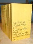 Horvath .:. Gesammelte Werke Horváth, Ödön von, Gesammelte Werke in acht Bänden. Frankfurt: Suhrkamp, 1972. 8 Bände. Kartoniert mit Leinenbezug. Kleinoktav. 2098 g* werkausgabe edition suhrkamp. - Herausgegeben von Traugott Krischke und Dieter Hildebrandt. 1. Volksstücke. 2. Schauspiele. 1 und 2 664 S.; 3./4. Komödien. 655 S.; 5: Lyrik, Prosa, Romane 1. 6. Romane 2. 5/6: 535 S.; 7. Szenisches, Fragmente und Varianten. 8. Prosa, Fragmente und Varianten, Exposés, Theoretisches, Briefe, Verse. Bibliographie und Register. 7/8: 759 Seiten. - Wenige Bleistiftanstreichungen. ISBN 3-518-00964-8 | Horvath | Werkausgaben | Deutsche Literatur Buchnummer 108864 CHF 50.00  | |  |