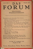 | Das Forum .:. 1919/03 Herzog, Wilhelm [Hrsg.],  Das Forum. 3. Jahr, Heft 6. Potsdam, Berlin: Gustav Kiepenheuer, 1919. Seite 416-510. Kartoniert. 161 g* Mit separatem Inhaltsverzeichnis 3. Jahrgang, I. Band, Oktober 1918 - März 1919. 6 Seiten. - Gebräunt und etwas angestaubt, leicht eselsohrig, Schnitt leicht stockfleckig, Umschlag lose, mit kleinen Rissen und Fehlstellen.