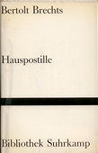 Brecht .:. Hauspostille Brecht, Bertolt, Hauspostille. Mit Anleitungen, Gesangsnoten und einem Anhang. 11.-15. Tausend. Berlin, Frankfurt: Suhrkamp, 1958. 164 Seiten mit Noten. Pappband (gebunden) mit Farbkopfschnitt und Schutzumschlag. 221 g* Bibliothek Suhrkamp; 4. - Leicht gebräunt, Seite 18/19 mit (Kaffee-?) Fleck, Schutzumschlag mit Gebrauchsspuren. Brecht | Deutsche Literatur Buchnummer 124745 CHF 15.00  | |  |